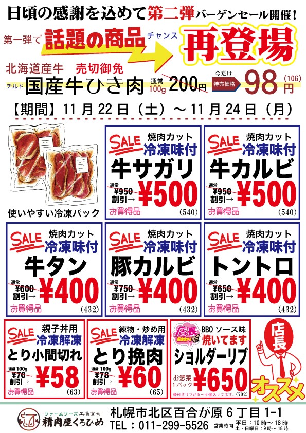 | 店舗名 | 精肉屋くろひめ 百合が原店 |